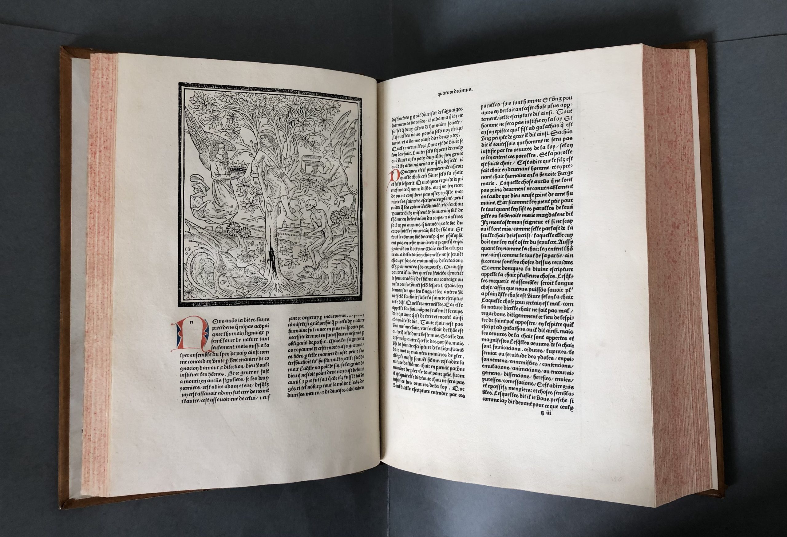 Die zweibändige Ausgabe von Augustinus, De civitate dei in frz. Übersetzung wurde 1486/87 gedruckt und enthält insgesamt 23 Holzschnitte.